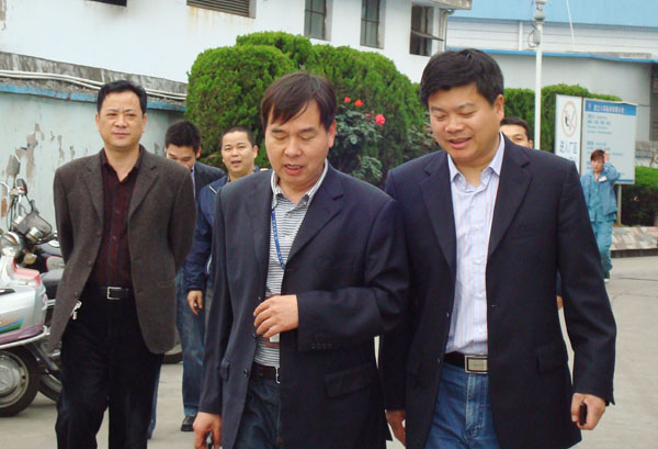 4117日,路桥区副区长戴冠福,区委常委、常务副区长邱士明相继来公司考察。他们走访企业,关心当前经济形势下企业的发展情况和应对措施。他们分别对公司在金融危机影响下仍然保持增长的态势表示了肯定,并勉励企业要不断突破,不断创新,争取更大的胜利。图为邱士明(右一)一行在董事长戴学利(前排左一)陪同下考察公司。(阿玲/文 施丹红/摄)